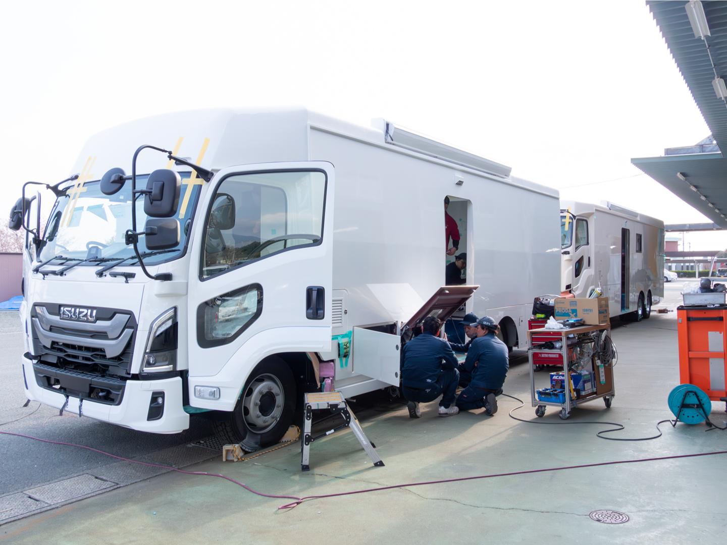 レントゲン検診車、競走馬運搬車、移動図書館車などの製造。チームで協力しながら「世界に一台」を作り上げていくやりがいがあります。